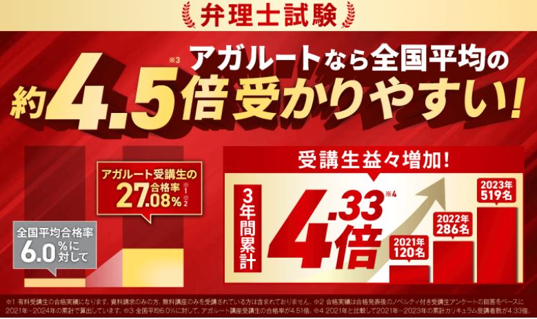 また、アガルートは合格者全額返金制度(短答式・論文式試験対策のみ)を有しています。