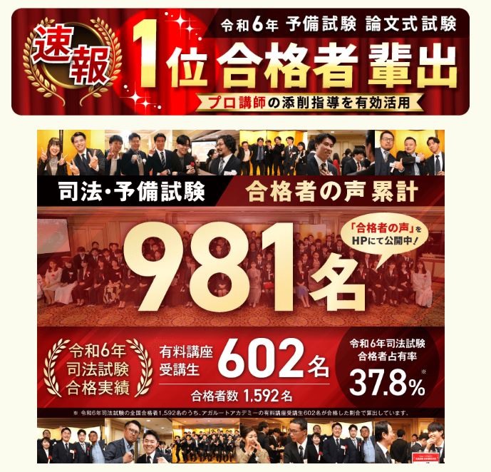 アガルートは令和6年度の司法試験合格者数および占有率が、602名で37.8%と非常に高い実績を誇り、業界内でトップクラスの実績となっています。
